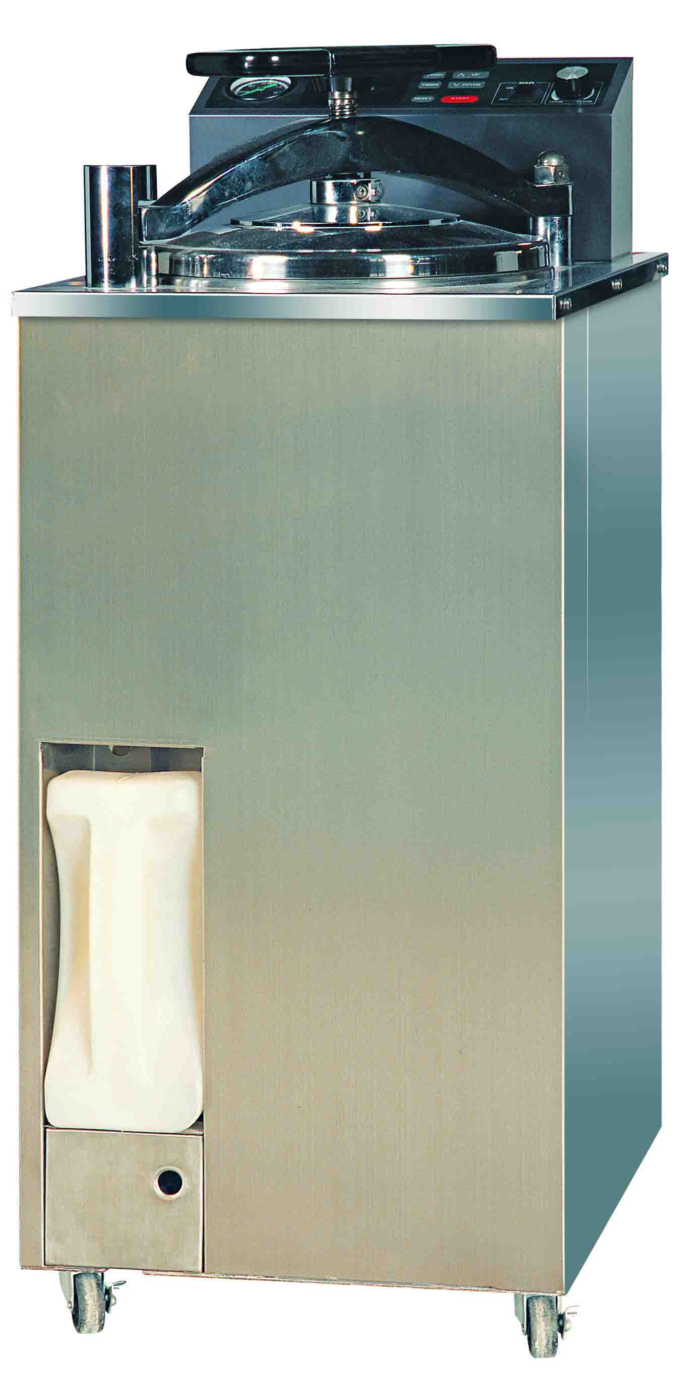 立式灭菌器主要技术参数: 产品参数 消毒容积:75L 设计压力:0.25MPa 设计温度:138℃ 工作压力:0.22Mpa 工作温度:135℃ 计时器计时:999Min 电源电压:220V 50Hz 电热管功率:3.5KW 工作室尺寸:∮360×250mm×3 外形尺寸:450×450×1170mm